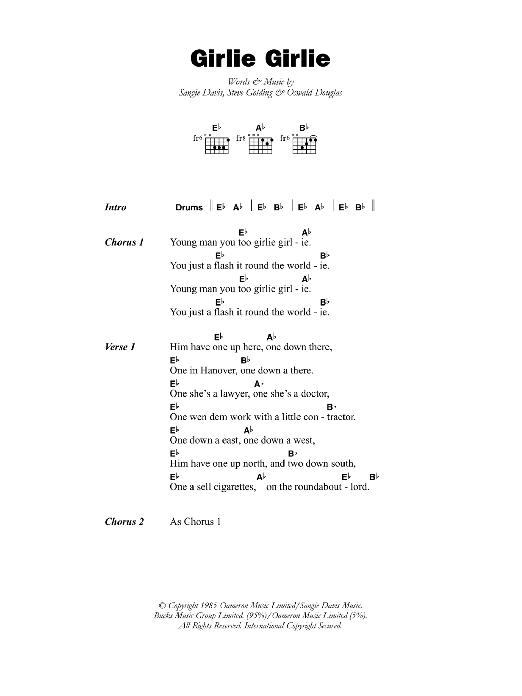 Download or print Sophia George Girlie Girlie sheet music, chords and digital score arranged for Guitar Chords/Lyrics. This Reggae score includes 3 page(s).
