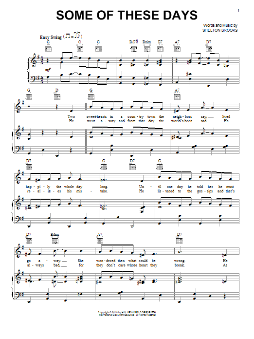 Download or print Sophie Tucker Some Of These Days sheet music, chords and digital score arranged for Piano, Vocal & Guitar Chords (Right-Hand Melody). This Blues score includes 4 page(s).