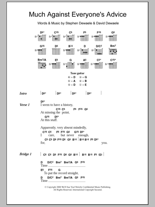Download or print Soulwax Much Against Everyone's Advice sheet music, chords and digital score arranged for Guitar Chords/Lyrics. This Rock score includes 2 page(s).