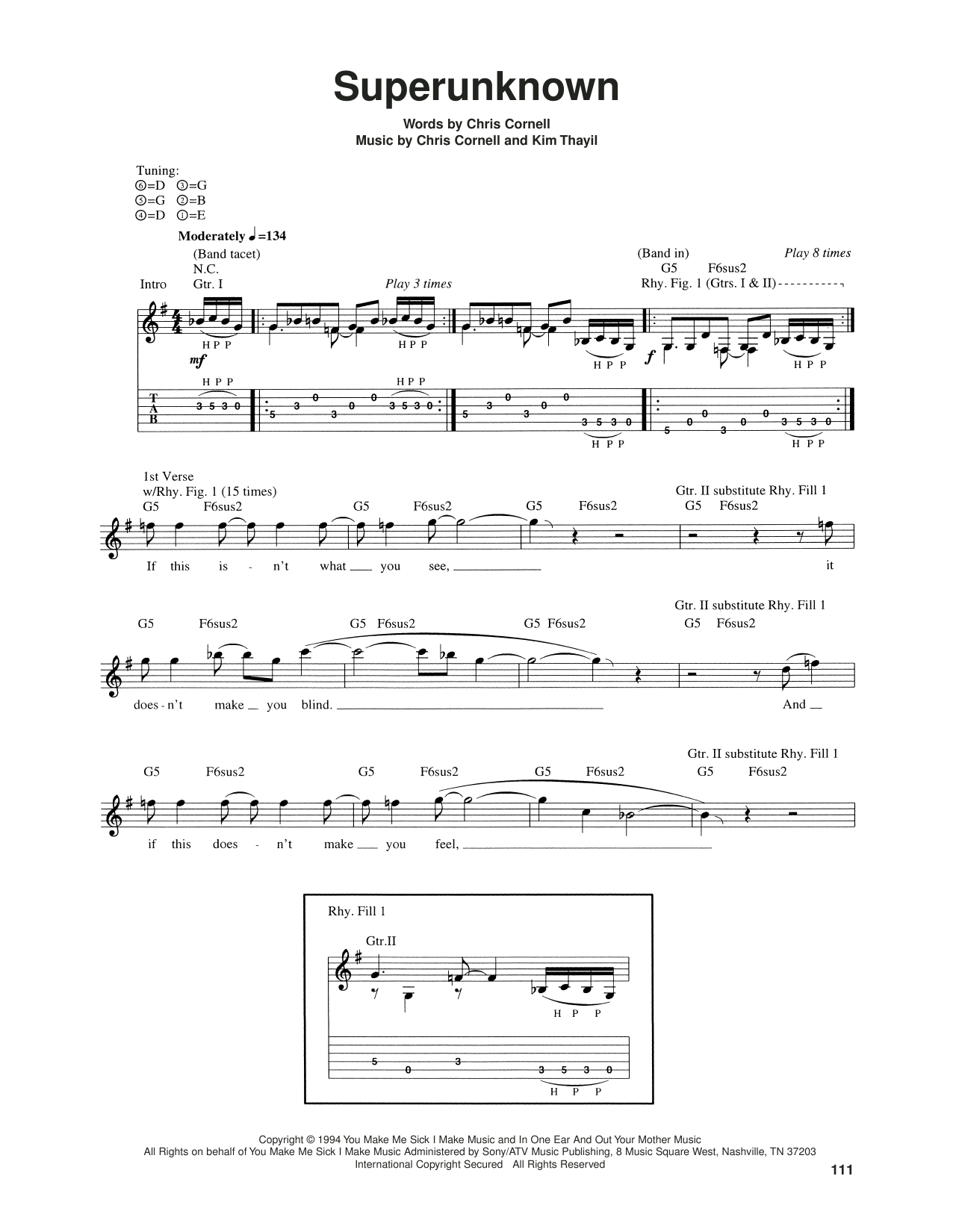 Download or print Soundgarden Superunknown sheet music, chords and digital score arranged for Guitar Tab. This Rock score includes 10 page(s).