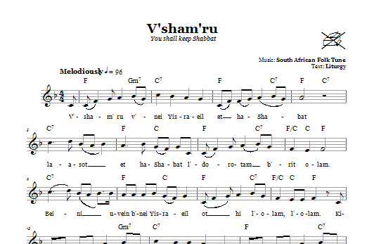 Download or print South African Folk Tune V'sham'ru (You Shall Keep Shabbat) sheet music, chords and digital score arranged for Lead Sheet / Fake Book. This Traditional score includes 1 page(s).