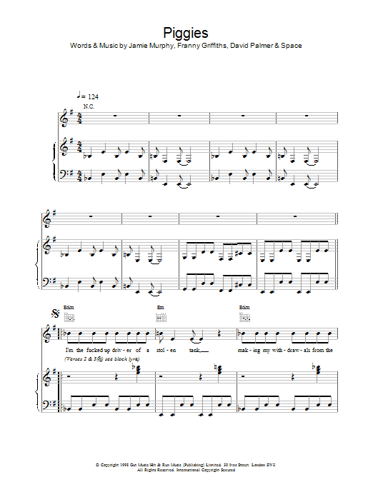 Download or print Space Piggies sheet music, chords and digital score arranged for Piano, Vocal & Guitar Chords. This Rock score includes 5 page(s).
