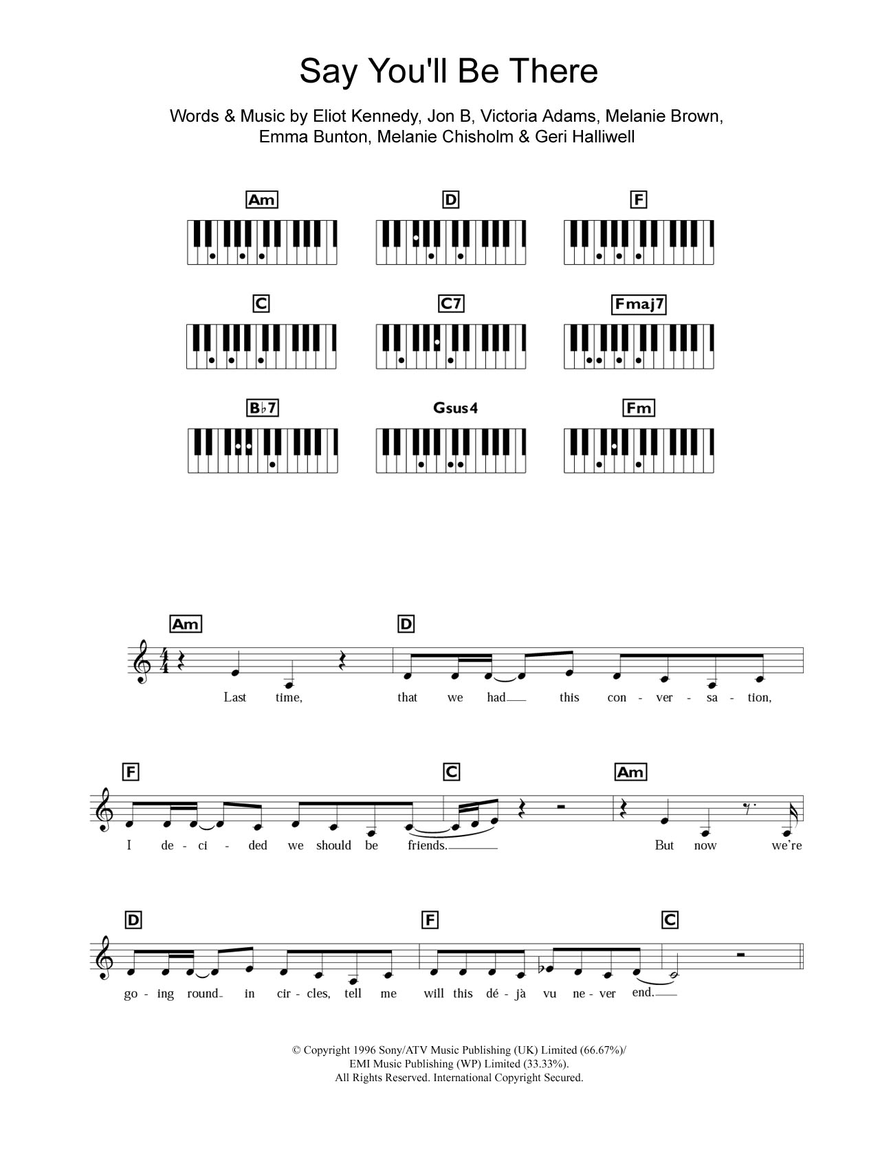 Download or print Spice Girls Say You'll Be There sheet music, chords and digital score arranged for Piano Chords/Lyrics. This Pop score includes 2 page(s).
