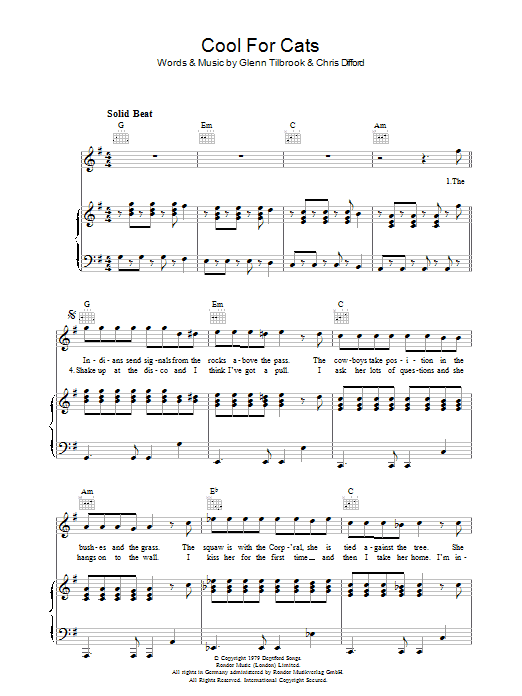 Download or print Squeeze Cool For Cats sheet music, chords and digital score arranged for Guitar Chords/Lyrics. This Rock score includes 3 page(s).