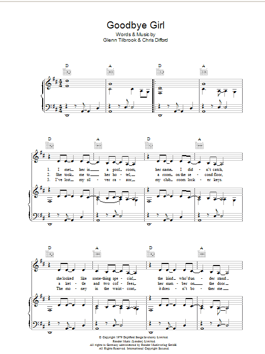 Download or print Squeeze Goodbye Girl sheet music, chords and digital score arranged for Piano, Vocal & Guitar Chords. This Pop score includes 4 page(s).