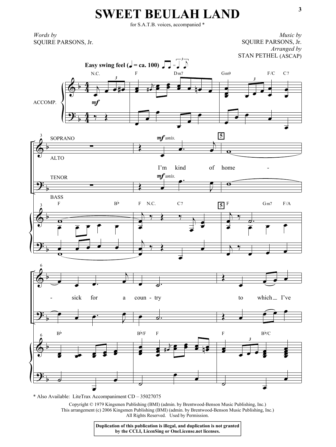 Download or print Squire Parsons Sweet Beulah Land (arr. Stan Pethel) sheet music, chords and digital score arranged for SATB Choir. This Gospel score includes 9 page(s).