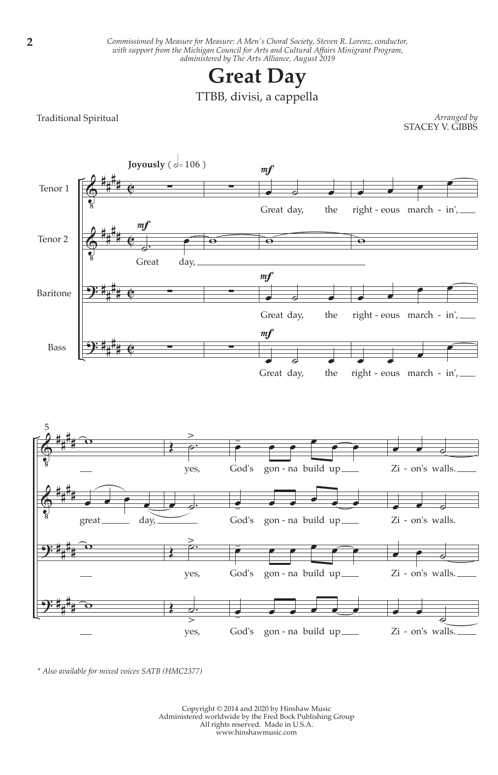 Download or print Stacey Gibbs Great Day! sheet music, chords and digital score arranged for SATB divisi Choir. This Spiritual score includes 11 page(s).