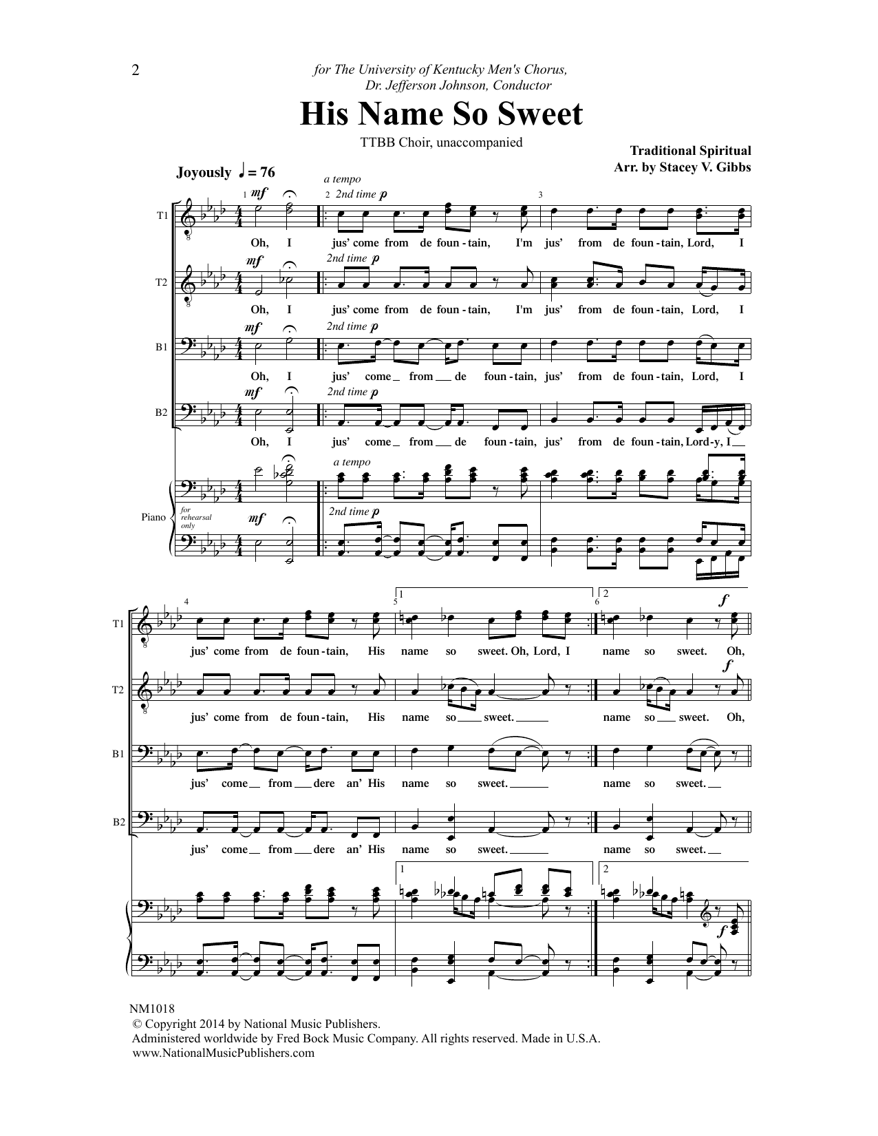 Download or print Stacey V. Gibbs His Name So Sweet sheet music, chords and digital score arranged for TTBB Choir. This Concert score includes 7 page(s).
