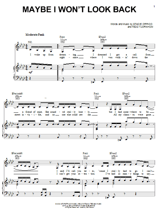 Download or print Stacie Orrico Maybe I Won't Look Back sheet music, chords and digital score arranged for Piano, Vocal & Guitar Chords (Right-Hand Melody). This Christian score includes 8 page(s).