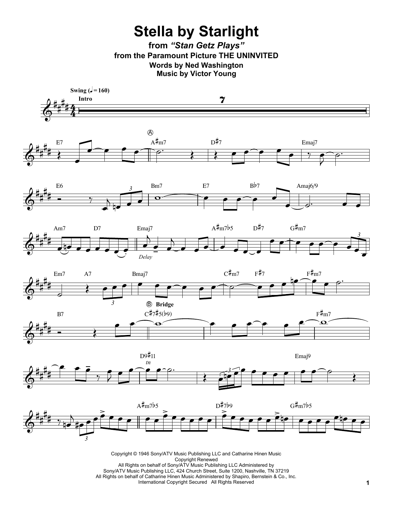 Download or print Stan Getz Stella By Starlight (from The Uninvited) sheet music, chords and digital score arranged for Alto Sax Transcription. This Jazz score includes 3 page(s).