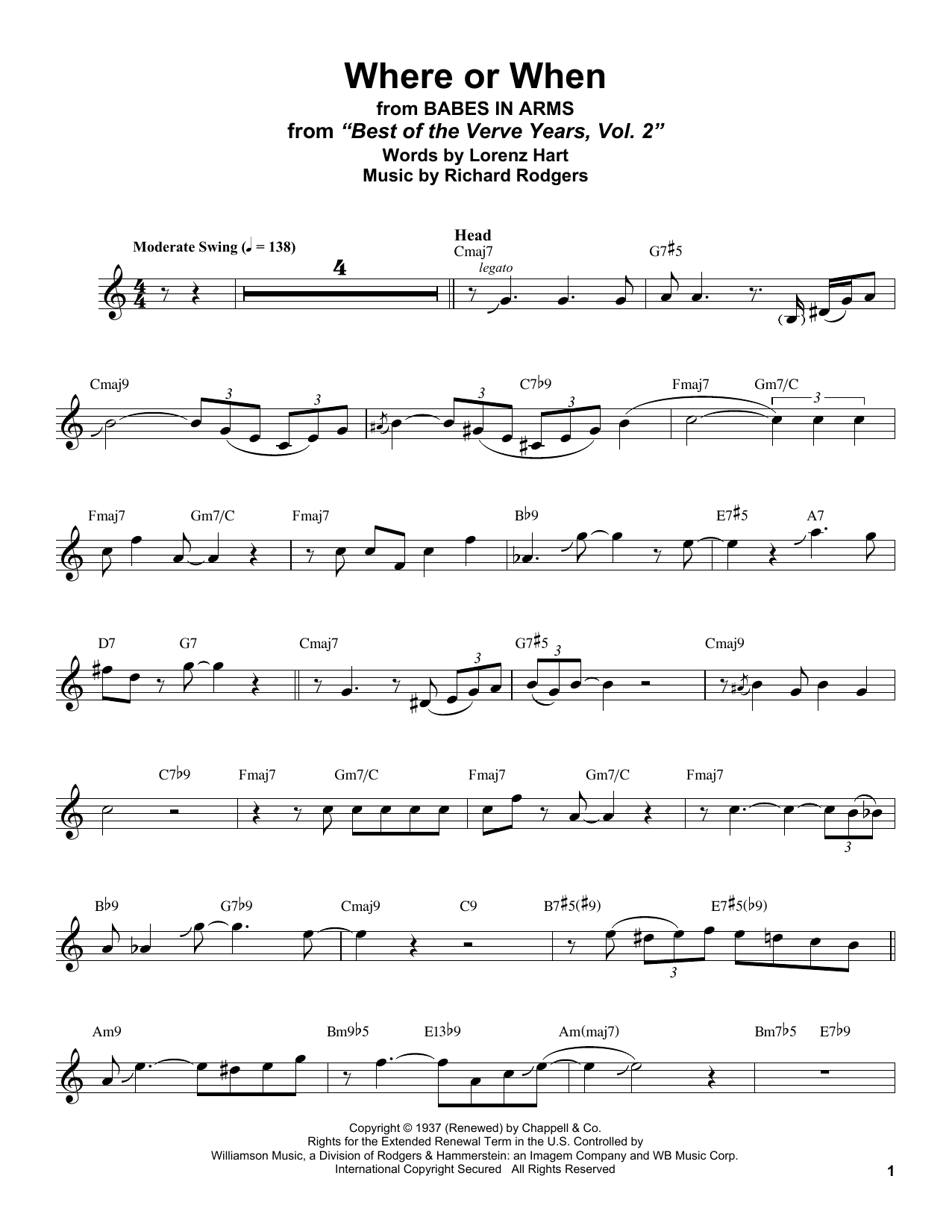 Download or print Stan Getz Where Or When (from Babes In Arms) sheet music, chords and digital score arranged for Alto Sax Transcription. This Standards score includes 6 page(s).