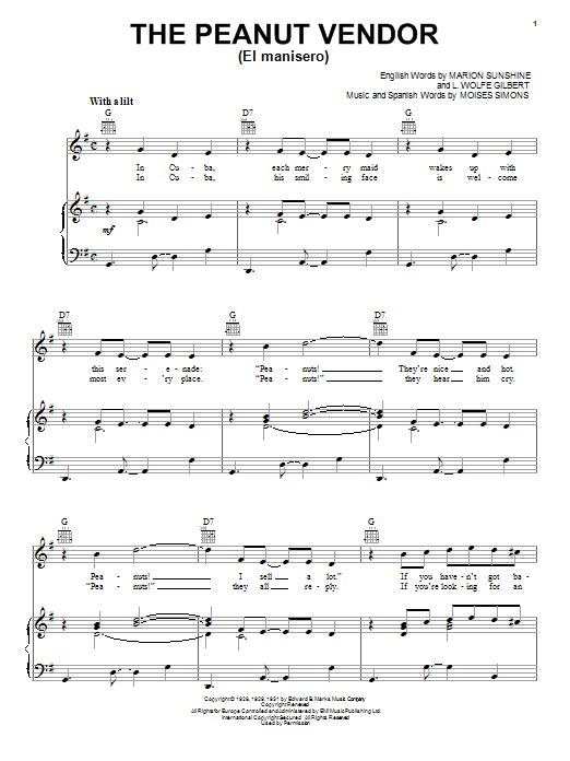 Download or print Stan Kenton The Peanut Vendor (El Manisero) sheet music, chords and digital score arranged for Piano, Vocal & Guitar Chords (Right-Hand Melody). This Jazz score includes 5 page(s).
