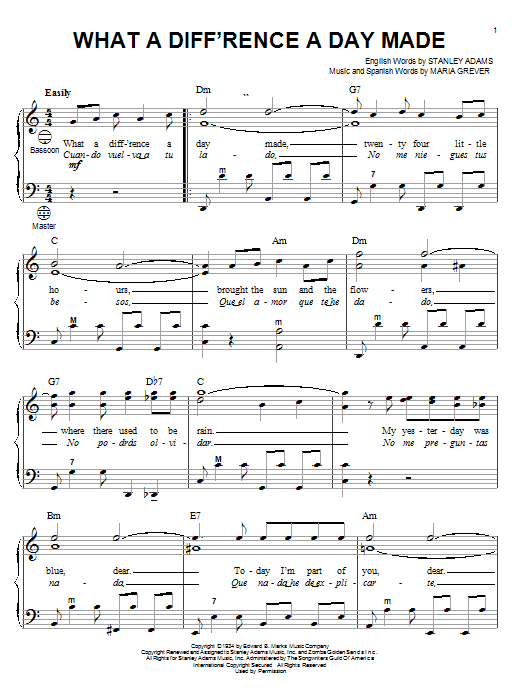Download or print Stanley Adams What A Diff'rence A Day Made sheet music, chords and digital score arranged for Very Easy Piano. This Jazz score includes 3 page(s).