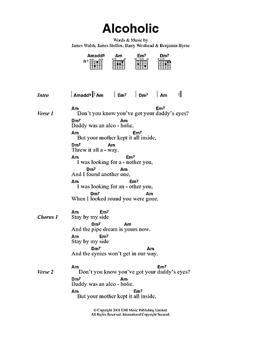 Download or print Starsailor Alcoholic sheet music, chords and digital score arranged for Guitar Chords/Lyrics. This Rock score includes 2 page(s).