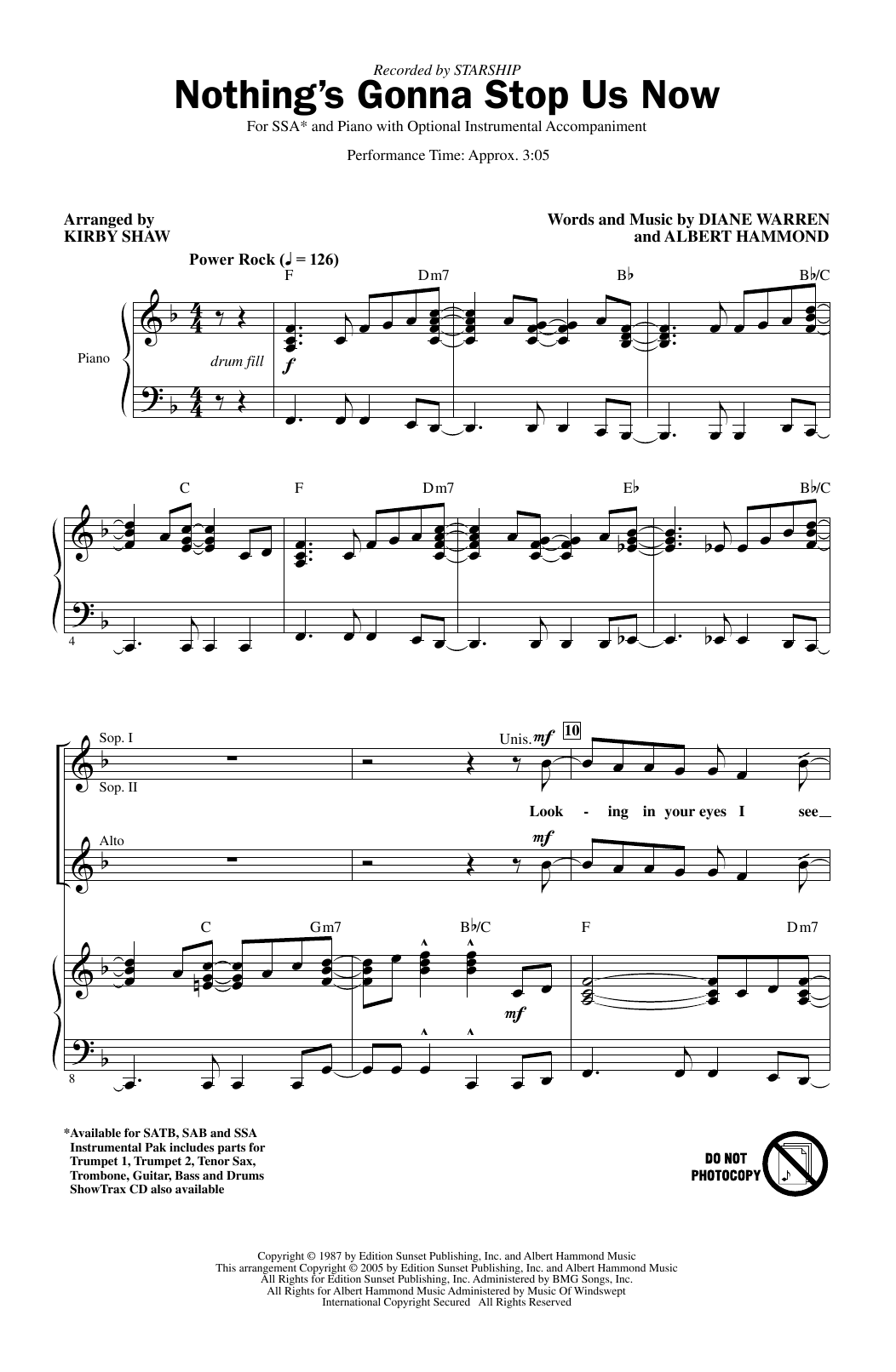 Download or print Starship Nothing's Gonna Stop Us Now (arr. Kirby Shaw) sheet music, chords and digital score arranged for SAB Choir. This Pop score includes 11 page(s).