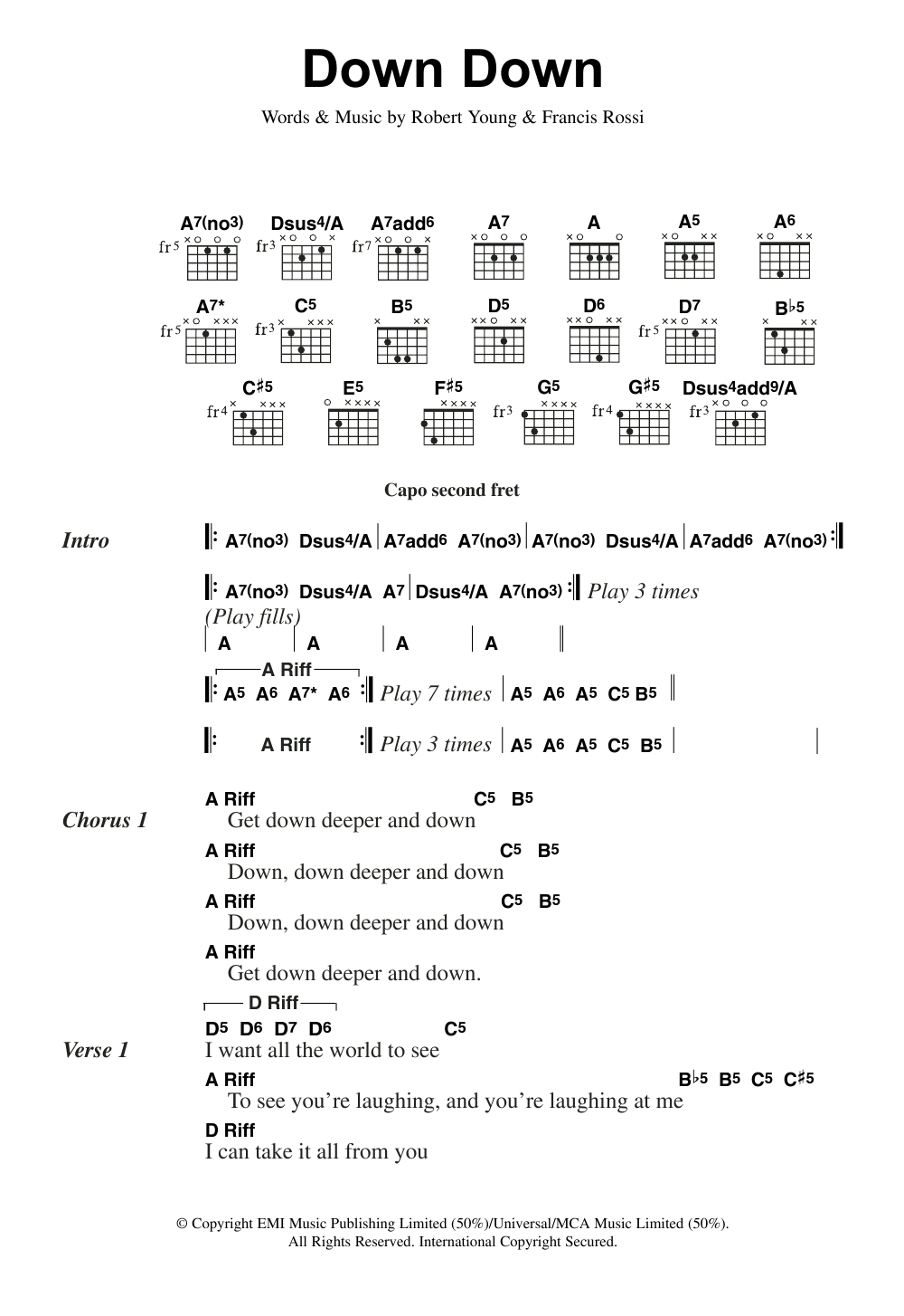 Download or print Status Quo Down Down sheet music, chords and digital score arranged for Guitar Chords/Lyrics. This Rock score includes 3 page(s).