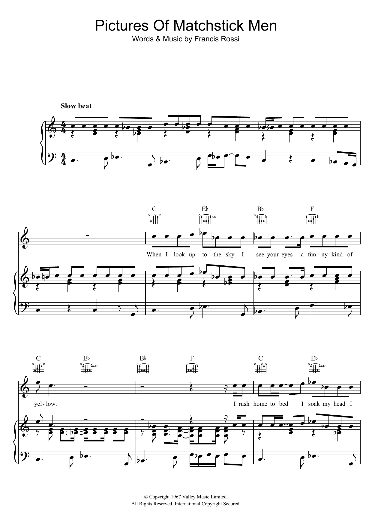 Download or print Status Quo Pictures Of Matchstick Men sheet music, chords and digital score arranged for Piano, Vocal & Guitar Chords. This Rock score includes 5 page(s).