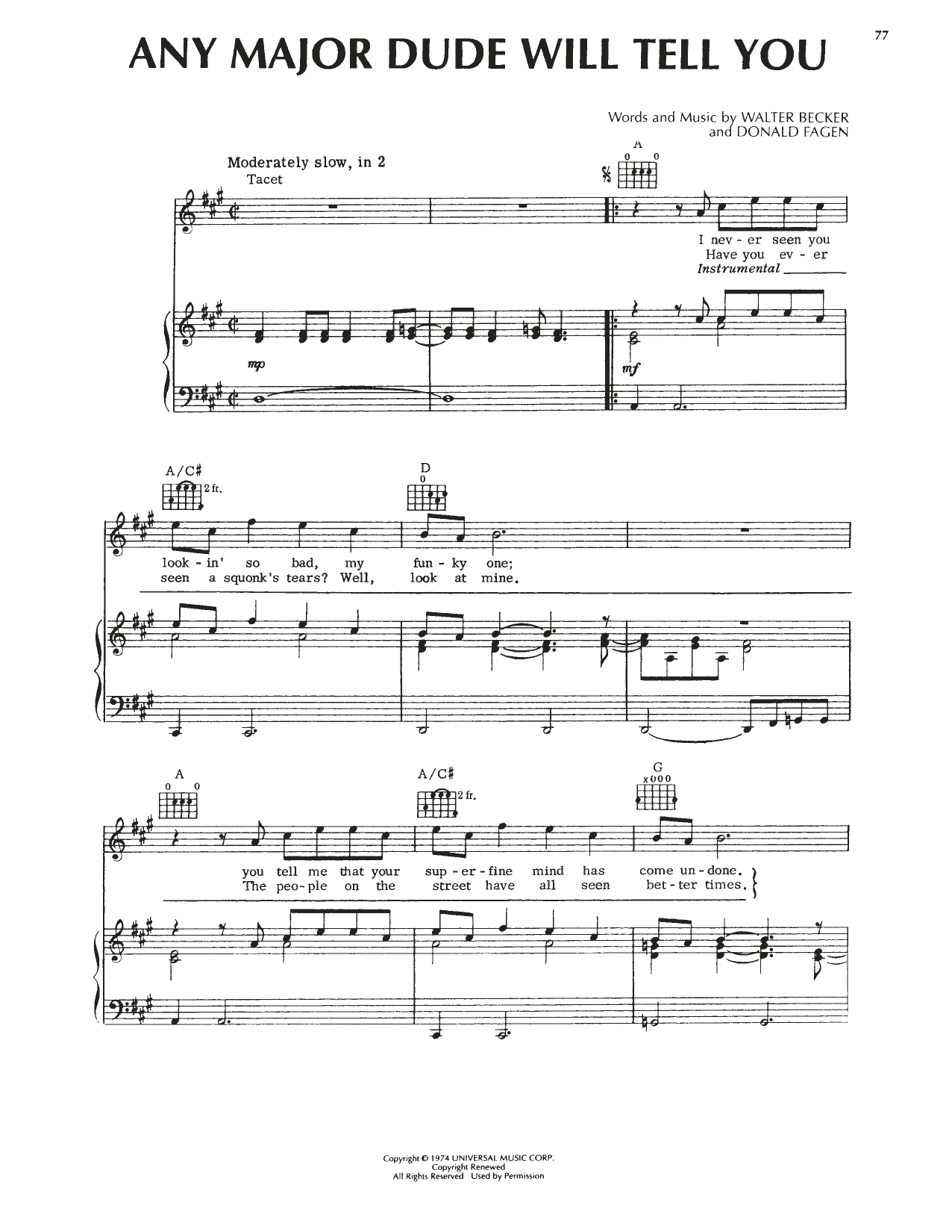 Download or print Steely Dan Any Major Dude Will Tell You sheet music, chords and digital score arranged for Piano, Vocal & Guitar Chords (Right-Hand Melody). This Pop score includes 4 page(s).