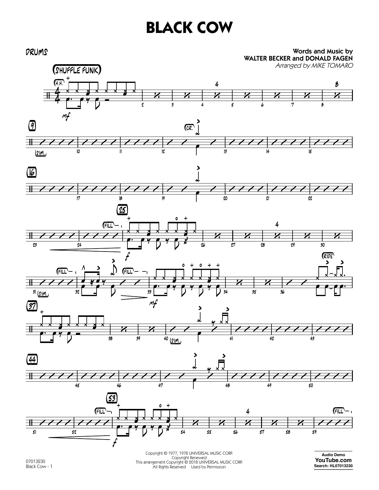 Download or print Steely Dan Black Cow (arr. Mike Tomaro) - Drums sheet music, chords and digital score arranged for Jazz Ensemble. This Pop score includes 2 page(s).