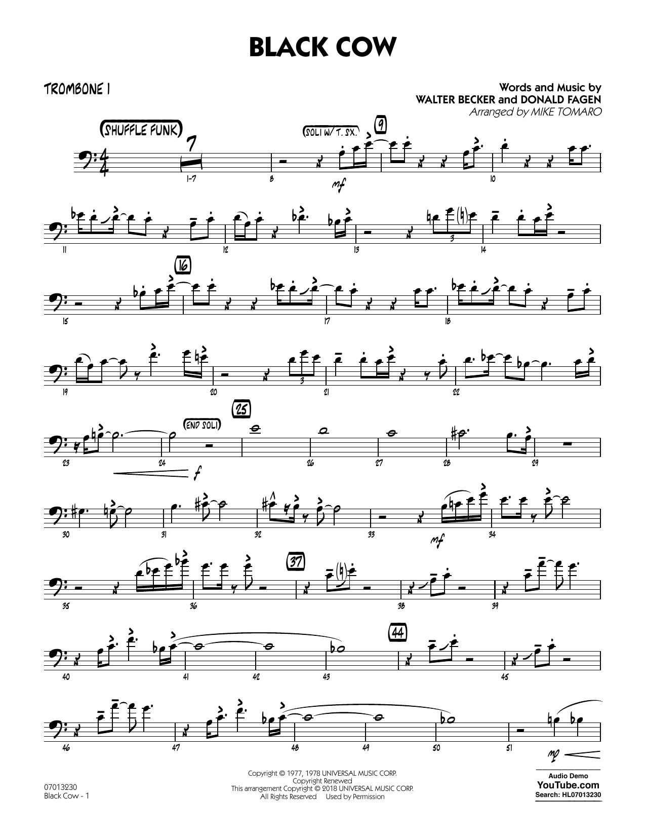 Download or print Steely Dan Black Cow (arr. Mike Tomaro) - Trombone 1 sheet music, chords and digital score arranged for Jazz Ensemble. This Pop score includes 2 page(s).