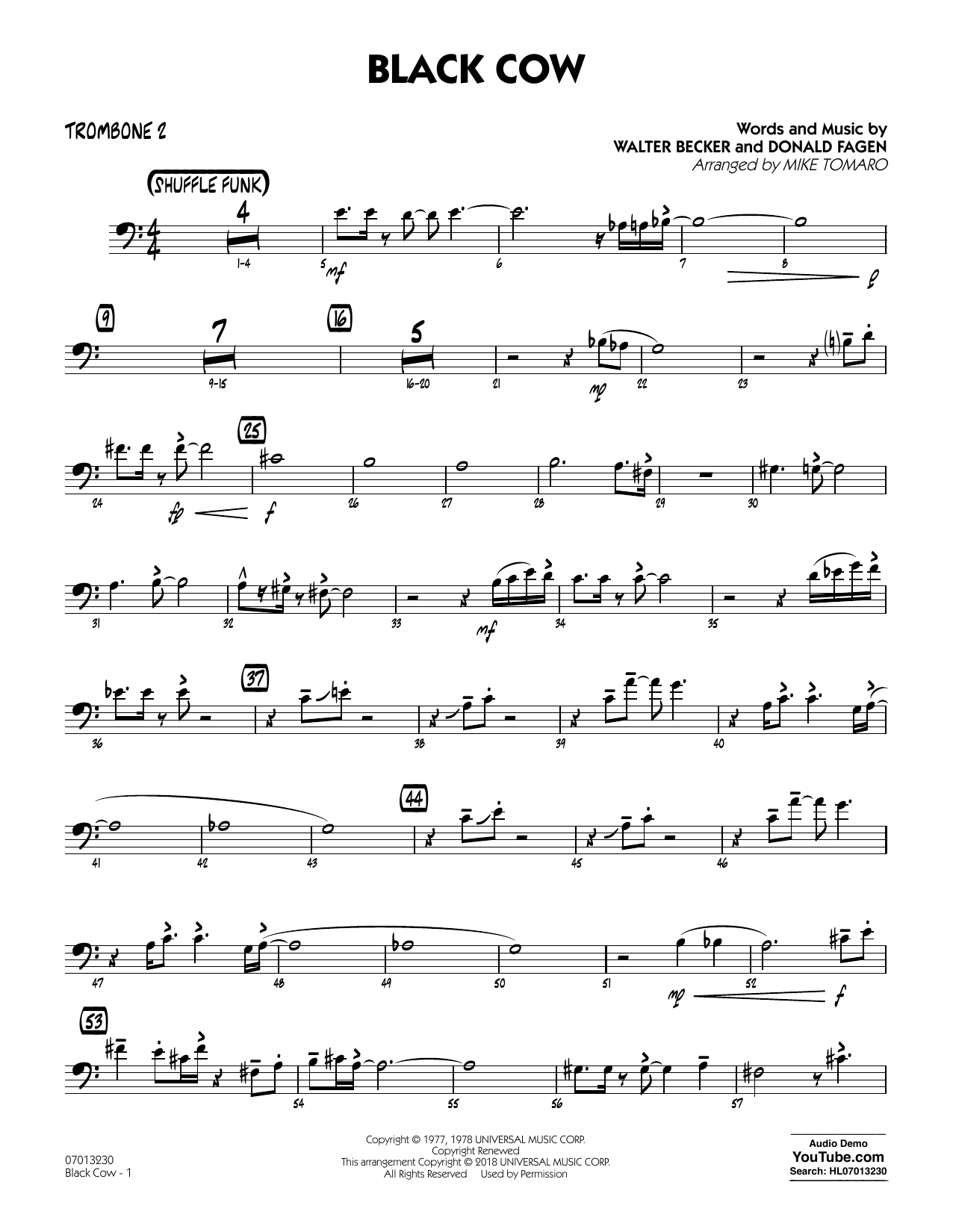 Download or print Steely Dan Black Cow (arr. Mike Tomaro) - Trombone 2 sheet music, chords and digital score arranged for Jazz Ensemble. This Pop score includes 2 page(s).