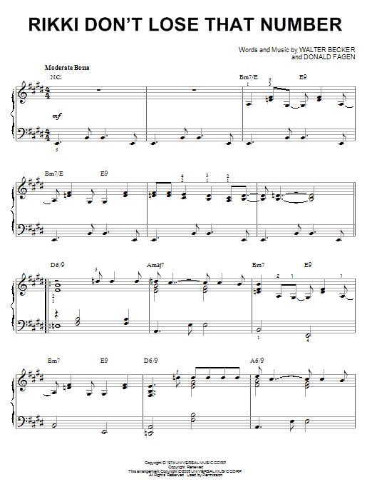Download or print Steely Dan Rikki Don't Lose That Number [Jazz version] (arr. Brent Edstrom) sheet music, chords and digital score arranged for Piano Solo. This Jazz score includes 4 page(s).