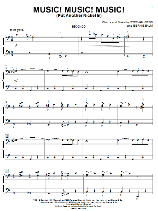 Download or print Stephan Weiss Music! Music! Music! (Put Another Nickel In) sheet music, chords and digital score arranged for Piano Duet. This Children score includes 4 page(s).