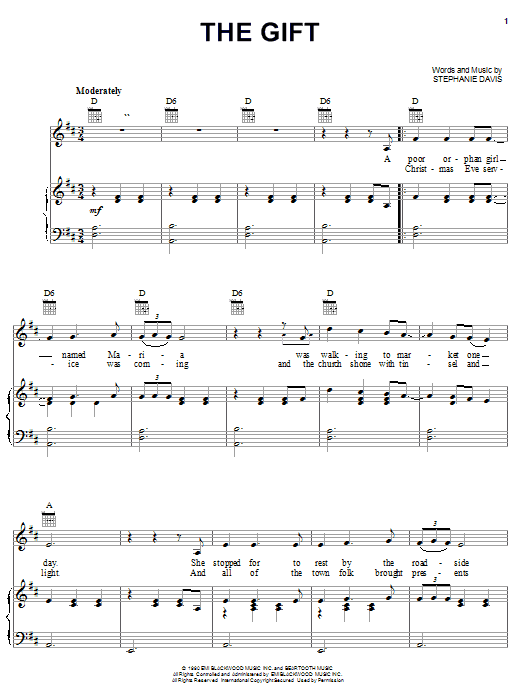 Download or print Stephanie Davis The Gift sheet music, chords and digital score arranged for Piano, Vocal & Guitar Chords (Right-Hand Melody). This Christmas score includes 6 page(s).