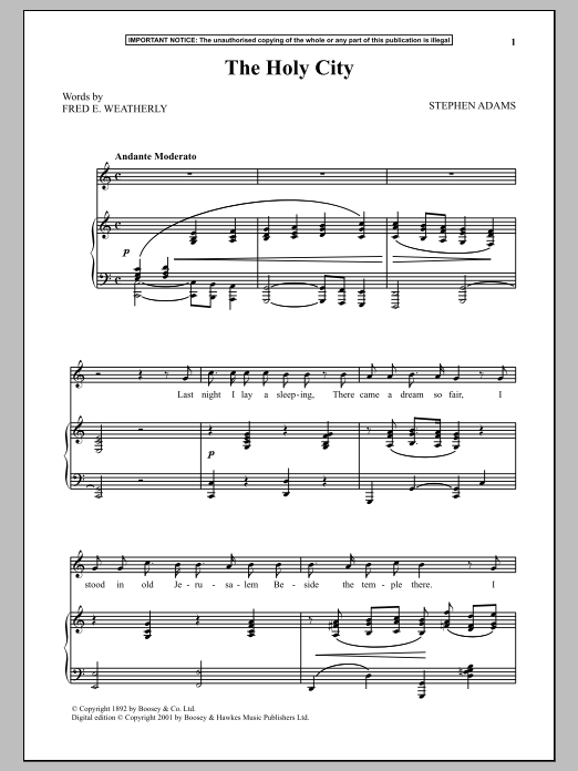 Download or print Stephen Adams The Holy City sheet music, chords and digital score arranged for Piano & Vocal. This Classical score includes 9 page(s).