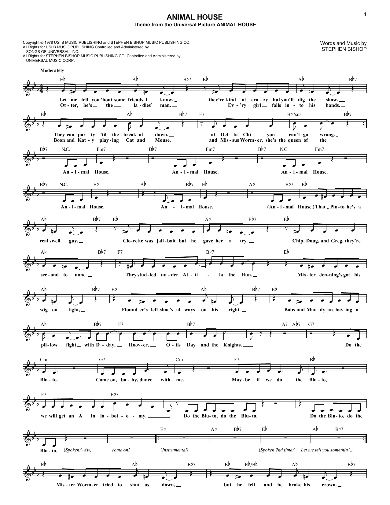 Download or print Stephen Bishop Animal House sheet music, chords and digital score arranged for Lead Sheet / Fake Book. This Film/TV score includes 2 page(s).