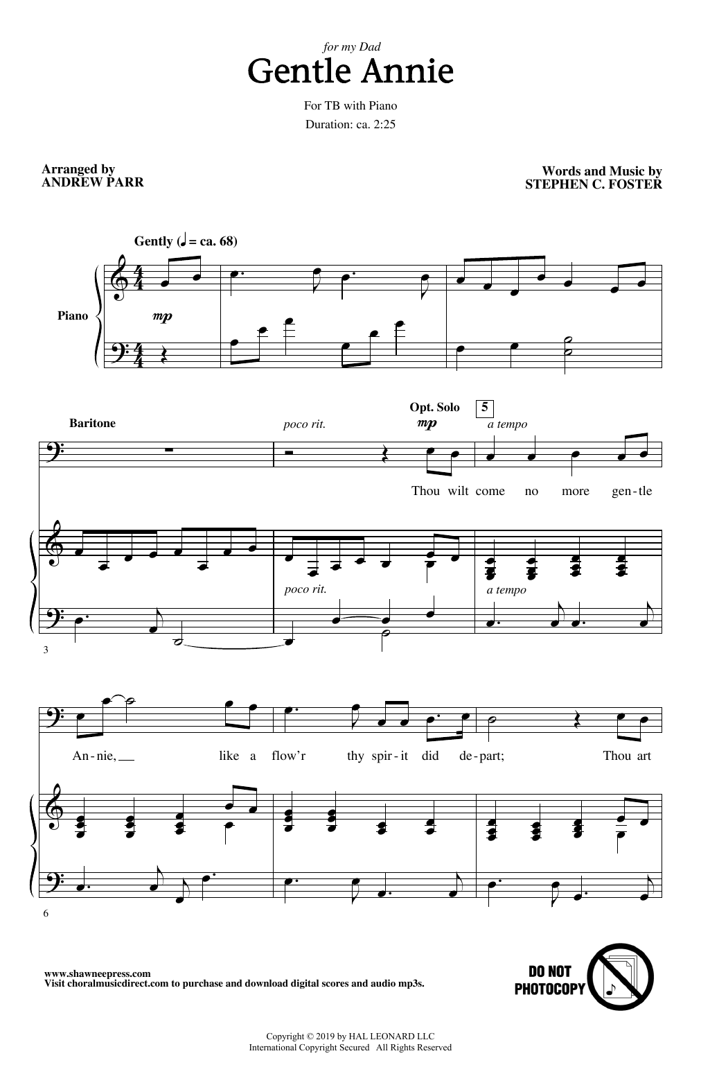 Download or print Stephen C. Foster Gentle Annie (arr. Andrew Parr) sheet music, chords and digital score arranged for TB Choir. This Concert score includes 6 page(s).