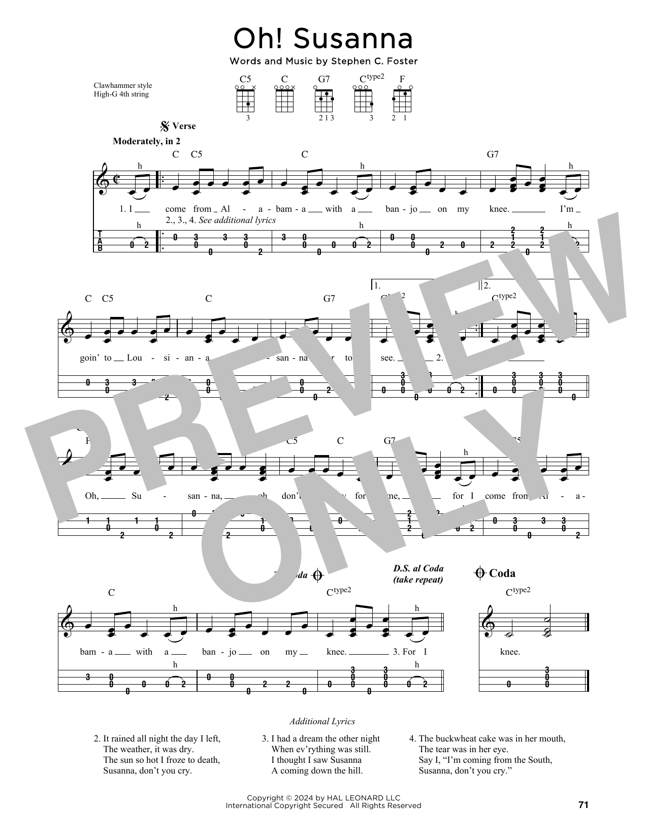 Download or print Stephen C. Foster Oh! Susanna (arr. Jim Schustedt) sheet music, chords and digital score arranged for Ukulele. This Children score includes 1 page(s).
