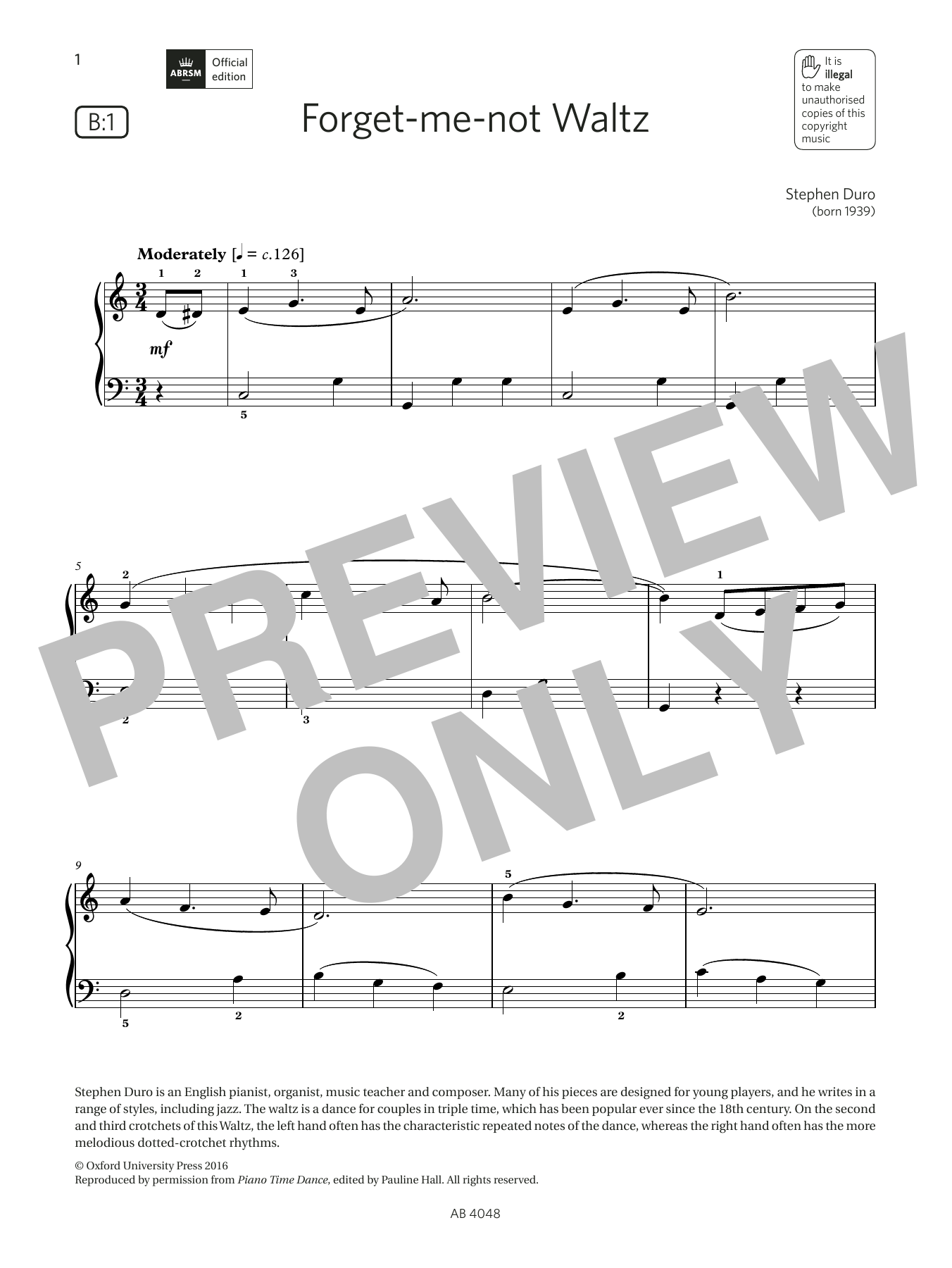 Download or print Stephen Duro Forget-me-not Waltz (Grade 2, list B1, from the ABRSM Piano Syllabus 2023 & 2024) sheet music, chords and digital score arranged for Piano Solo. This Classical score includes 2 page(s).