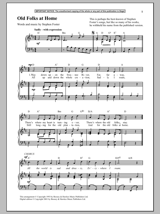 Download or print Stephen Foster Old Folks At Home sheet music, chords and digital score arranged for Piano & Vocal. This Traditional score includes 2 page(s).