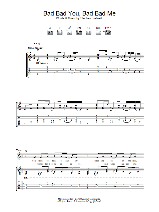 Download or print Stephen Fretwell Bad Bad You, Bad Bad Me sheet music, chords and digital score arranged for Guitar Tab. This Pop score includes 3 page(s).