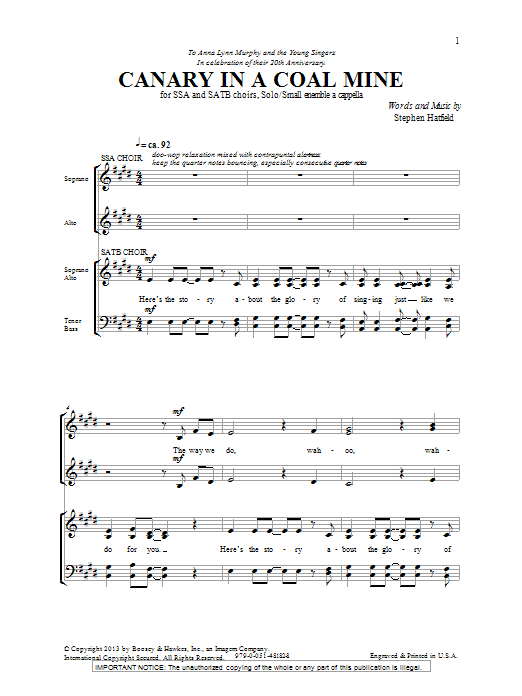 Download or print Stephen Hatfield Canary In A Coal Mine sheet music, chords and digital score arranged for SATB Choir. This Pop score includes 14 page(s).