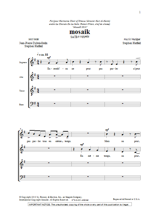 Download or print Stephen Hatfield Mosaik sheet music, chords and digital score arranged for SATB Choir. This Classical score includes 9 page(s).