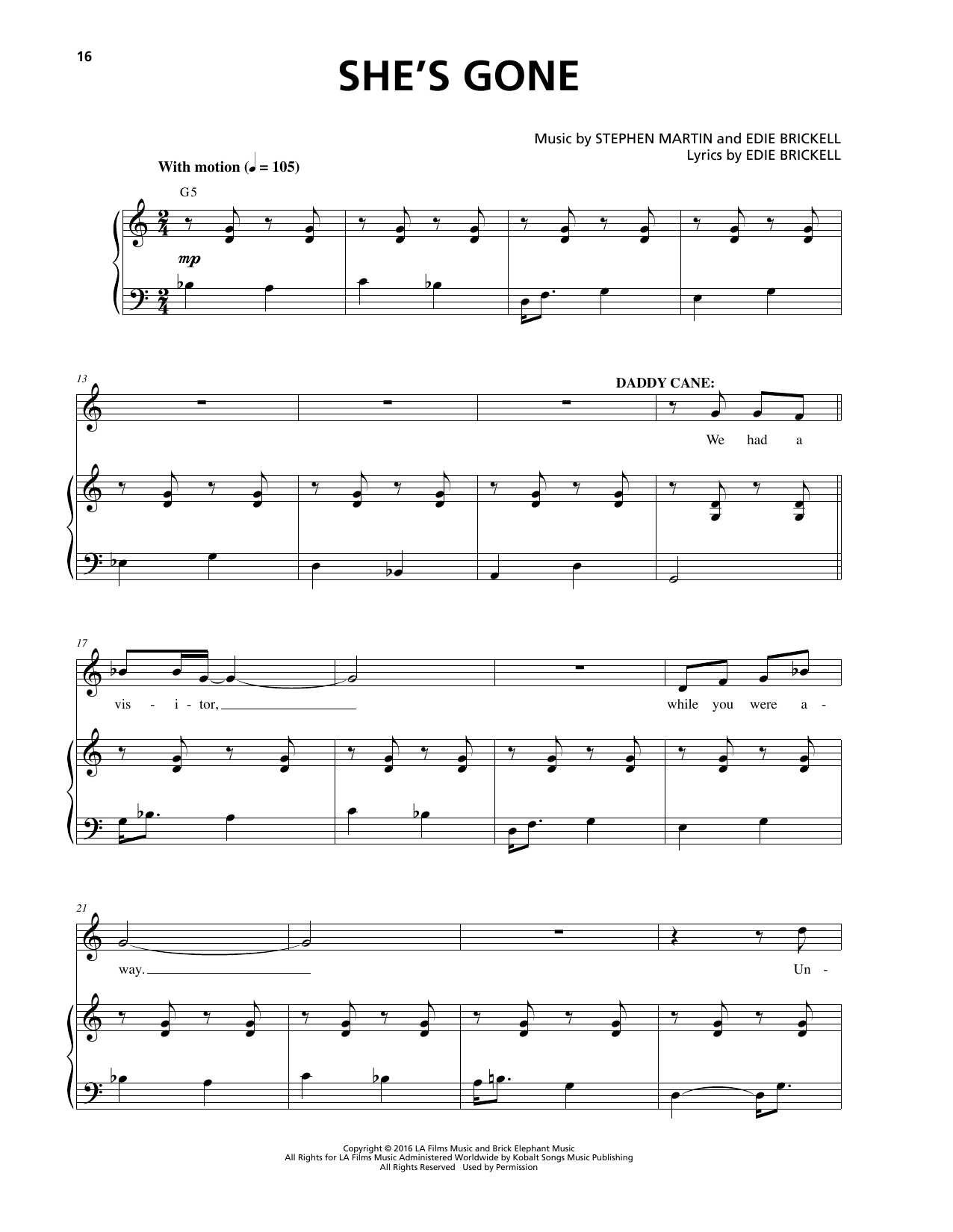 Download or print Stephen Martin & Edie Brickell She's Gone sheet music, chords and digital score arranged for Piano & Vocal. This Musical/Show score includes 8 page(s).