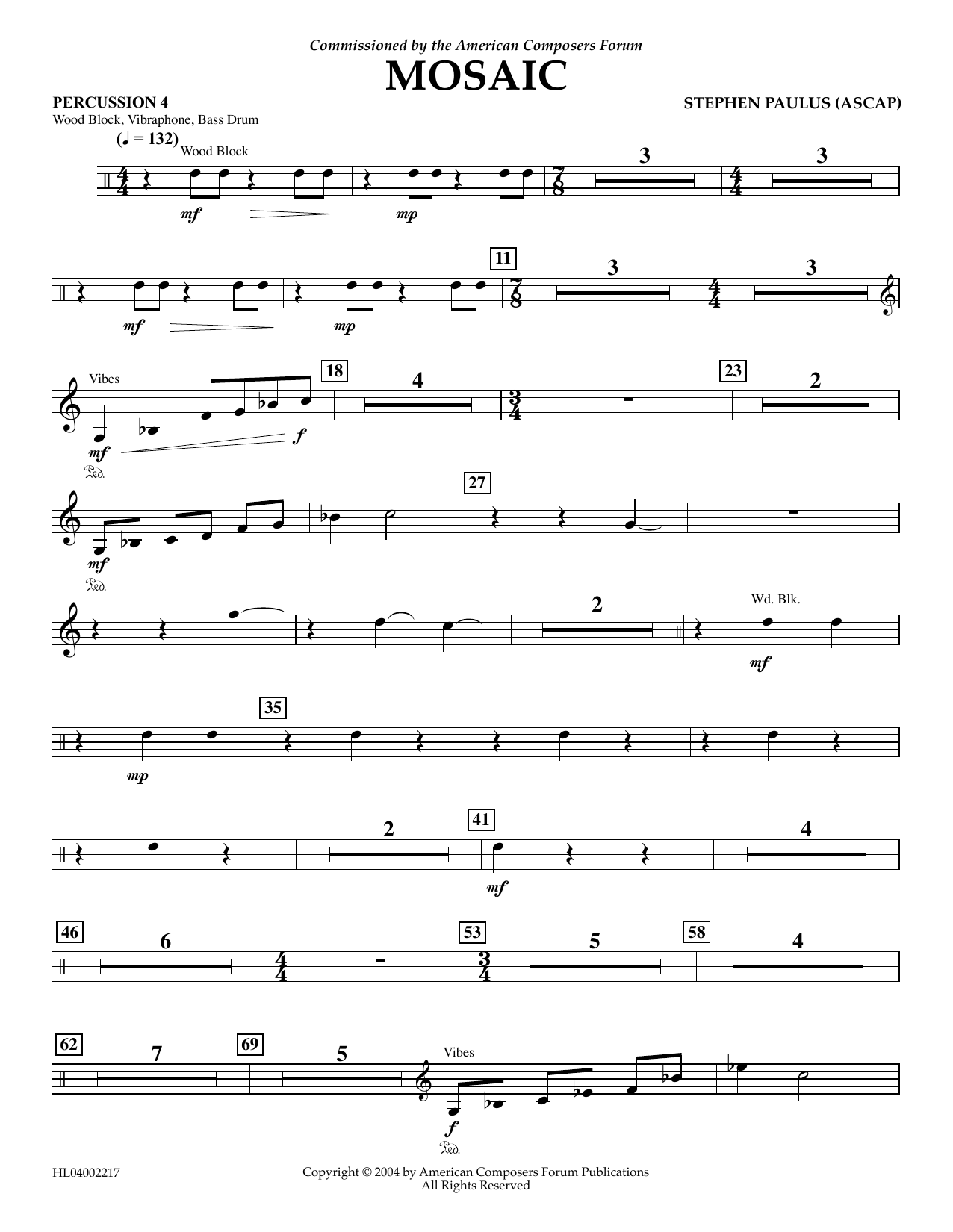 Download or print Stephen Paulus Mosaic - Percussion 4 sheet music, chords and digital score arranged for Concert Band. This American score includes 2 page(s).