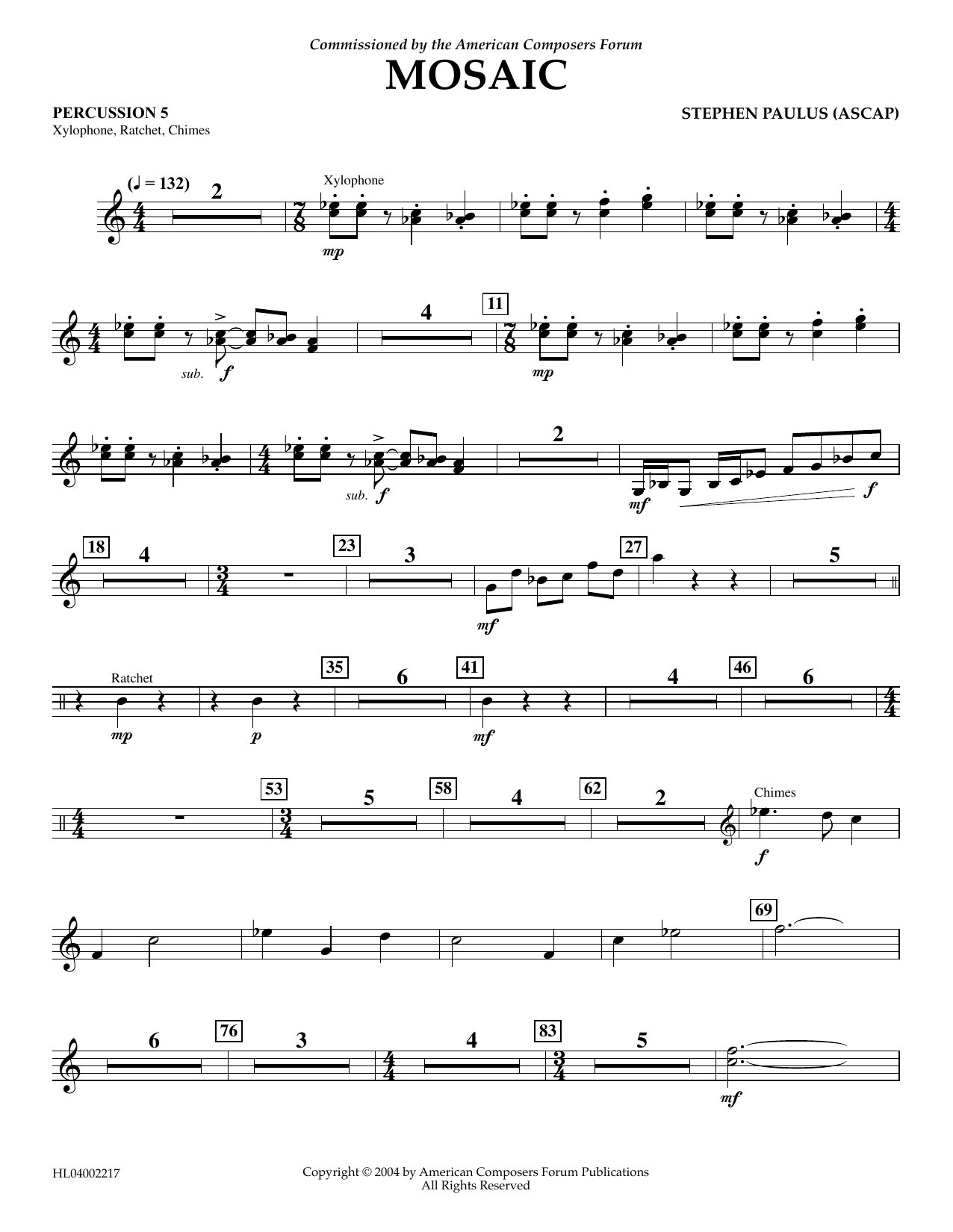 Download or print Stephen Paulus Mosaic - Percussion 5 sheet music, chords and digital score arranged for Concert Band. This American score includes 2 page(s).