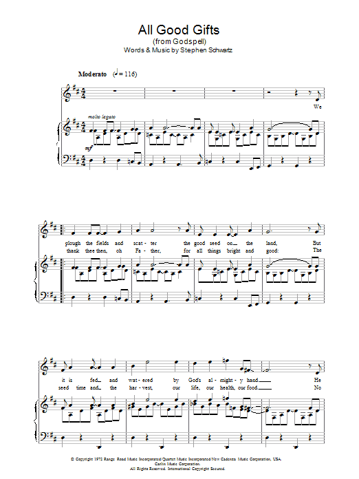 Download or print Stephen Schwartz All Good Gifts (from Godspell) sheet music, chords and digital score arranged for Piano, Vocal & Guitar Chords (Right-Hand Melody). This Film/TV score includes 4 page(s).
