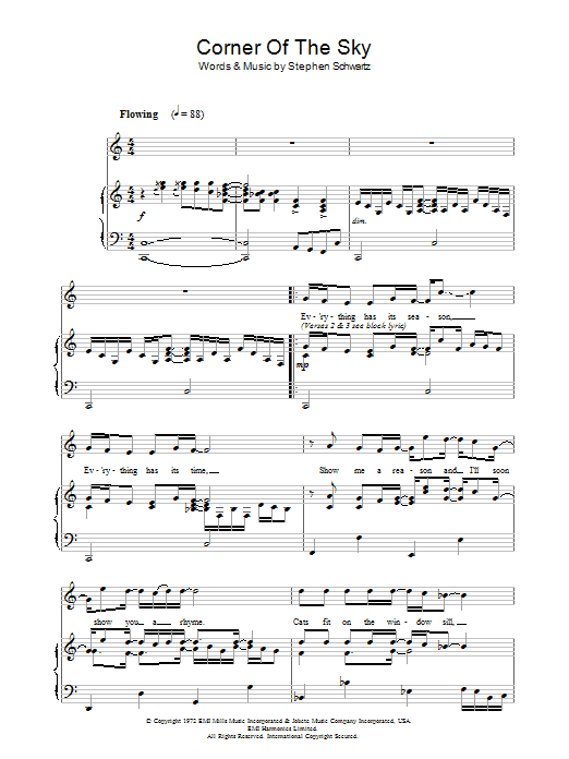 Download or print Stephen Schwartz Corner Of The Sky (from Pippin) sheet music, chords and digital score arranged for Piano, Vocal & Guitar Chords (Right-Hand Melody). This Musical/Show score includes 4 page(s).