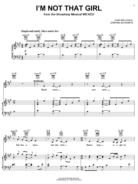Download or print Stephen Schwartz I'm Not That Girl (from Wicked) sheet music, chords and digital score arranged for Beginning Piano Solo. This Musical/Show score includes 3 page(s).