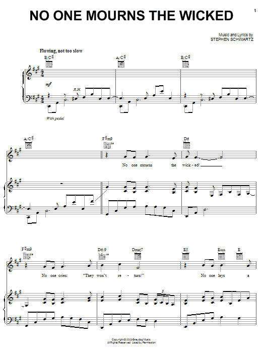 Download or print Stephen Schwartz No One Mourns The Wicked (from Wicked) sheet music, chords and digital score arranged for Piano & Vocal. This Broadway score includes 6 page(s).