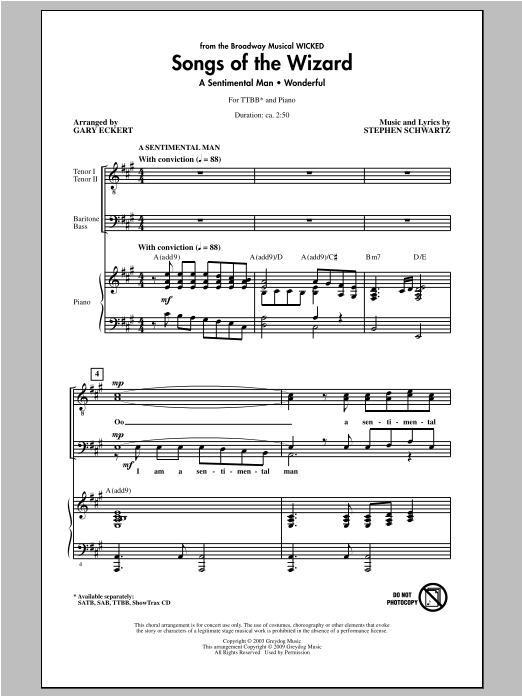 Download or print Gary Eckert Songs of the Wizard (from Wicked) sheet music, chords and digital score arranged for SATB Choir. This Broadway score includes 10 page(s).