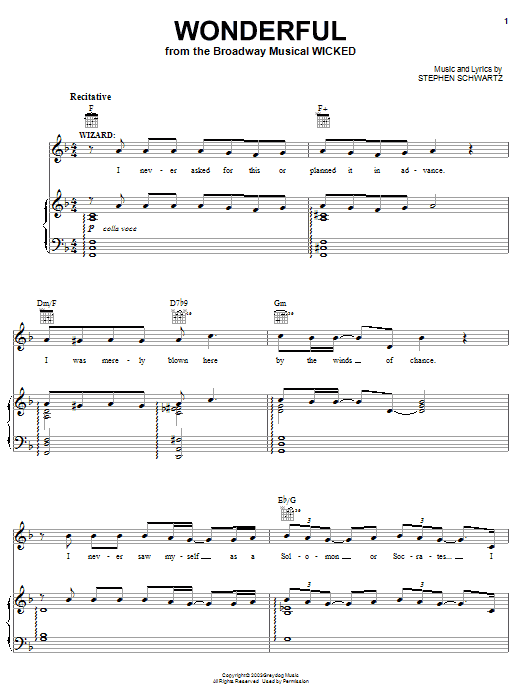 Download or print Stephen Schwartz Wonderful (from Wicked) sheet music, chords and digital score arranged for Lead Sheet / Fake Book. This Musical/Show score includes 2 page(s).