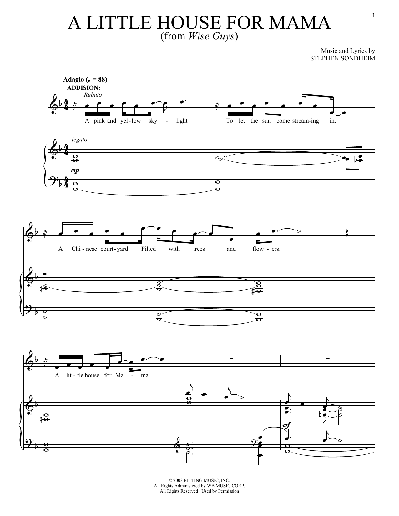 Download or print Stephen Sondheim A Little House For Mama sheet music, chords and digital score arranged for Piano & Vocal. This Broadway score includes 7 page(s).
