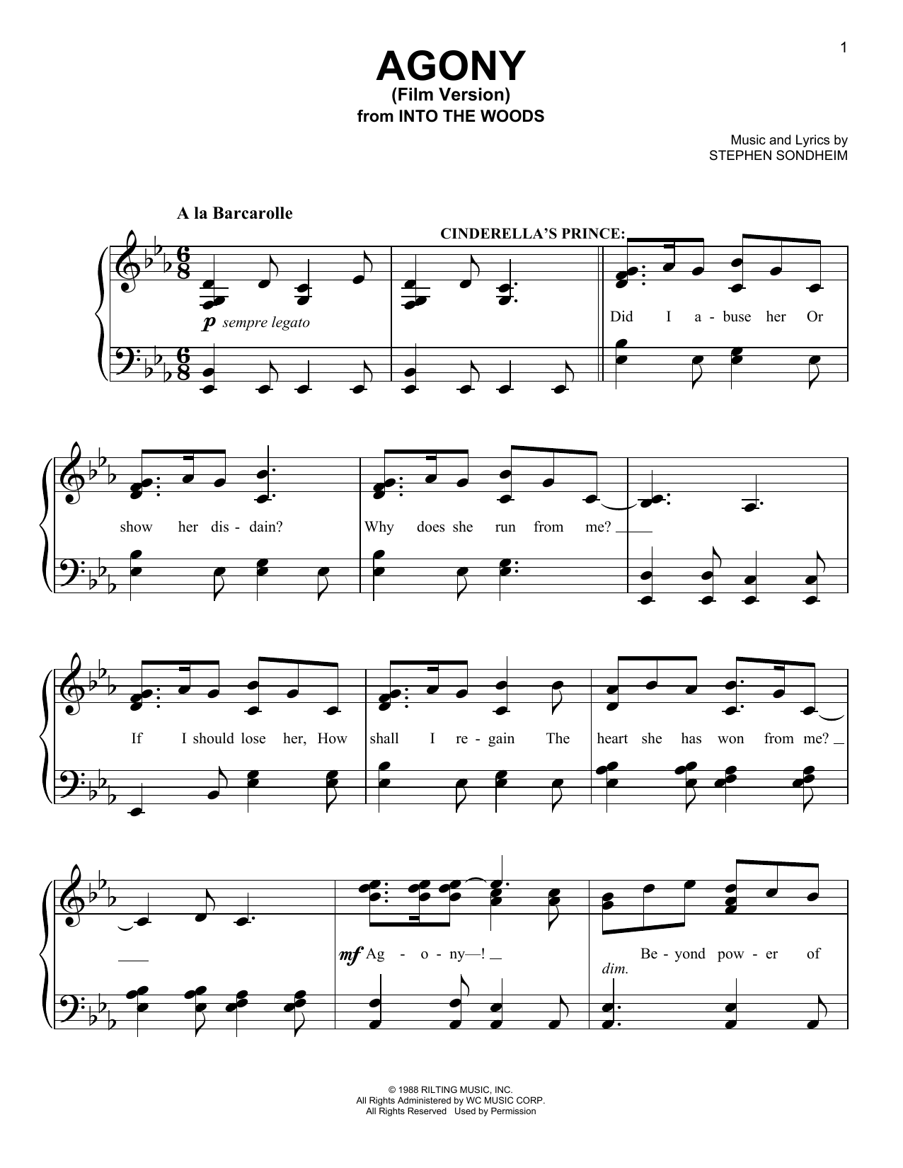 Download or print Stephen Sondheim Agony (Film Version) (from Into The Woods) sheet music, chords and digital score arranged for Piano & Vocal. This Musical/Show score includes 7 page(s).