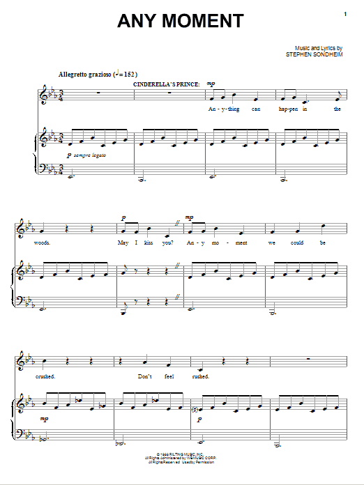 Download or print Stephen Sondheim Any Moment - Part I (from Into The Woods) sheet music, chords and digital score arranged for Piano & Vocal. This Musical/Show score includes 5 page(s).