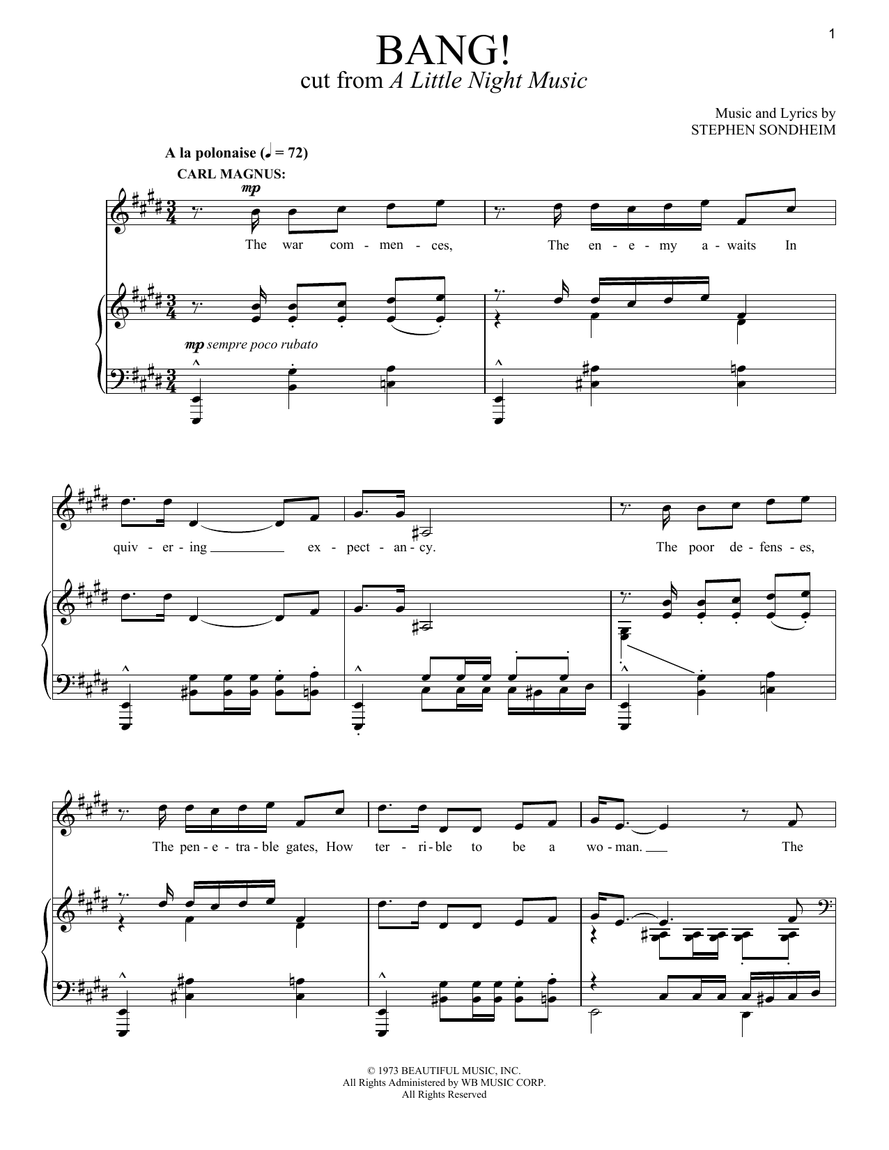 Download or print Stephen Sondheim Bang! sheet music, chords and digital score arranged for Vocal Duet. This Broadway score includes 10 page(s).
